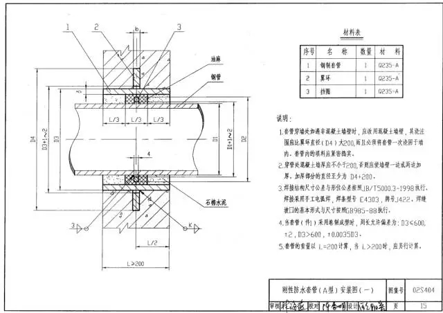 穿線密閉套管說明:1、當(dāng)迎水面為腐蝕性介質(zhì)時,可采用封堵材料將縫隙封堵;2.套管穿墻處如遇非混凝土墻壁時,應(yīng)局部改用混凝土墻壁,其澆注范圍應(yīng)比翼環(huán)直徑(DS)大200,并且必須將套管一次澆固…